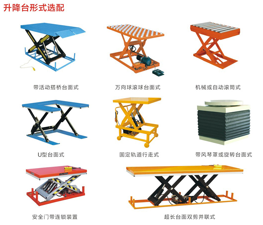 根据用户的不同需求,固定剪叉机可非标定制台面角度翻转、台面旋转、台面伸缩式、台面滚珠式、台面滚轴式、台面滚筒式,舞台式、U型台面式、风琴罩、固定轨道行走式全电动手推平台等等,满足不同需求